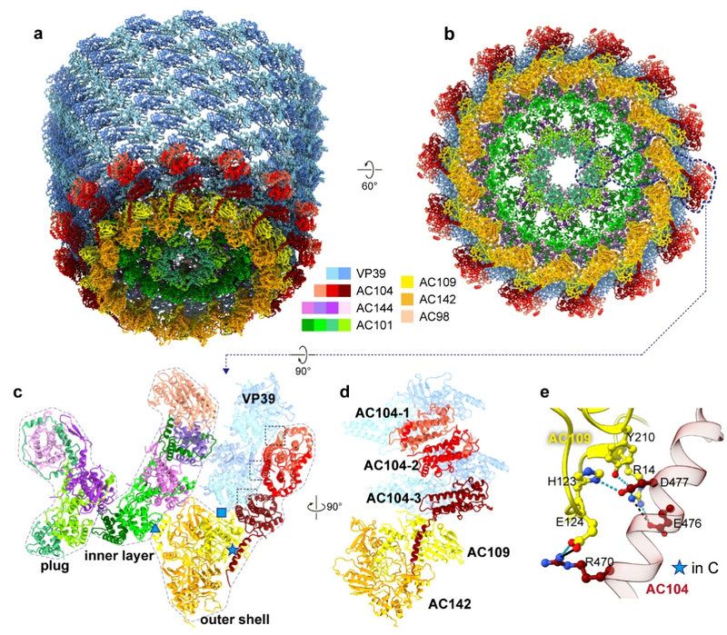 圖a,b從不同角度展示了桿狀病毒AcMNPV尾部整體的原子模型。圖c展示了尾部的一個(gè)最小組成單元。圖d和e詳細(xì)展示了蛋白與蛋白之間的具體相互作用。