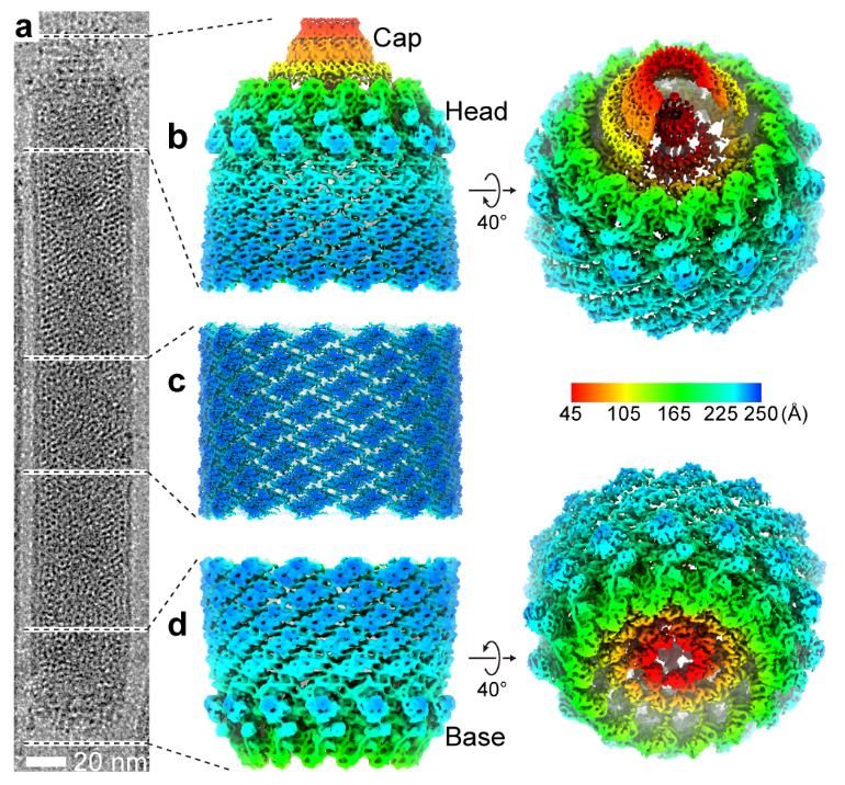 圖a展示了一個(gè)桿狀病毒AcMNPV病毒顆粒在冷凍電鏡下的形象。圖b,c,d分別展示桿狀病毒AcMNPV的頭部,螺旋柱體和尾部的三維結(jié)構(gòu)。
