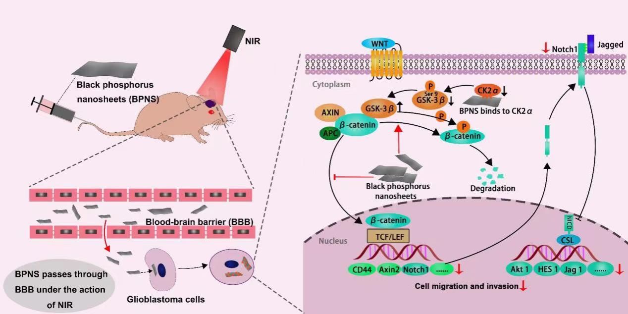 中大新聞網(wǎng)訊(通訊員熊月)長期以來,膠質(zhì)母細(xì)胞瘤(glioblastoma,GBM)的治療一直是醫(yī)學(xué)領(lǐng)域的一個(gè)重要挑戰(zhàn)。由于該類腫瘤的高度侵襲性和惡性程度,使得其對(duì)傳統(tǒng)治療方法的反應(yīng)較差,因此尋找更有效的治療手段成為迫切的需求。在過去的幾年里,一些研究集中于利用納米技術(shù)來改善膠質(zhì)瘤的治療效果。其中,黑磷納米片(Black phosphorus nanosheets,BPNS)作為一種新興的納米材料引起了廣泛關(guān)注,它不但具有良好生物相容性以及抑制腫瘤細(xì)胞增殖的生物活性,還能在近紅外光的作用下穿過血腦屏障,這使得它有望成為治療膠質(zhì)母細(xì)胞瘤的候選方式。