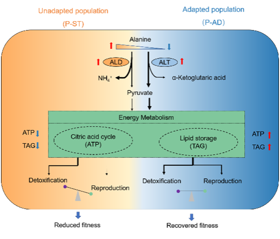 隨后的研究發(fā)現(xiàn)丙氨酸流向決定了褐飛虱對(duì)抗蟲水稻的適應(yīng)性水平。丙氨酸轉(zhuǎn)氨酶(Alanine aminotransferase,ALT)介導(dǎo)的丙氨酸向丙酮酸的轉(zhuǎn)化促進(jìn)了褐飛虱對(duì)抗蟲水稻IR36的適應(yīng)。更重要的是,丙氨酸轉(zhuǎn)氨酶介導(dǎo)的丙氨酸代謝是褐飛虱適應(yīng)抗蟲水稻后下游能量分配的基礎(chǔ)。與未適應(yīng)種群(P-ST)相比,抗性適應(yīng)種種群P-AD內(nèi)脂肪體和卵巢的能量?jī)?chǔ)備水平顯著提高,這導(dǎo)致了適應(yīng)抗蟲水稻后的褐飛虱解毒能力的明顯提高和生態(tài)適合度的恢復(fù)(圖2)。