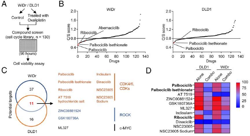 為了尋找治療靶點(diǎn),研究團(tuán)隊(duì)使用小分子抑制劑文庫(kù)進(jìn)行高通量藥物篩選,發(fā)現(xiàn)CDK4/6抑制劑可以顯著提高奧沙利鉑藥效(圖3)。