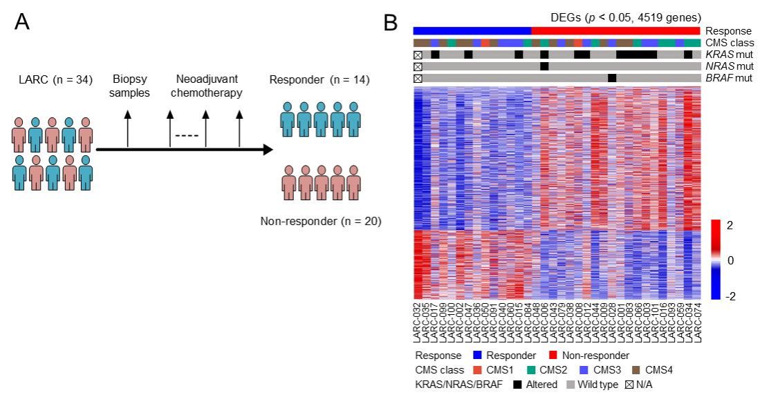 研究團(tuán)隊(duì)通過收集34例新輔助治療前的局部進(jìn)展期直腸癌患者腫瘤樣本,根據(jù)新輔助治療后手術(shù)切除的腫瘤樣本病理切片進(jìn)行腫瘤退縮評(píng)價(jià)(Tumor regression grade,TRG),對(duì)病人進(jìn)行分類,并分析耐藥相關(guān)的腫瘤分子特征(圖2)。
