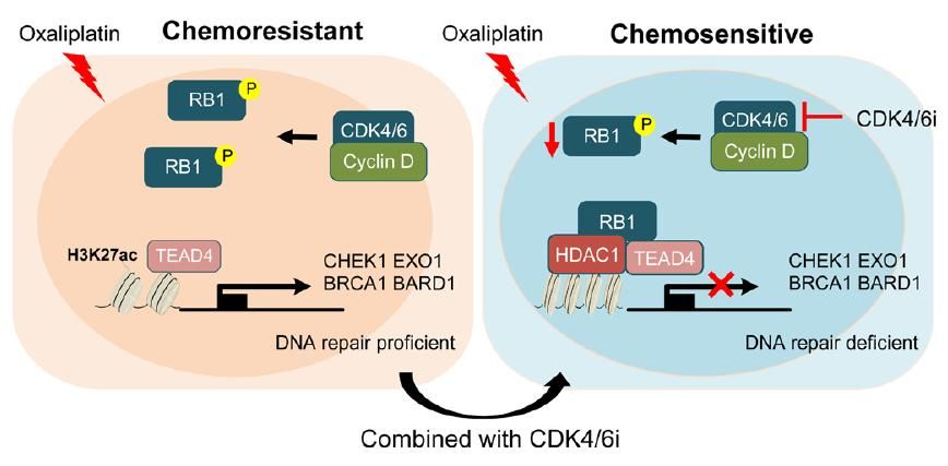 最后,通過整合分析RNA-seq和ChIP-seq數(shù)據(jù),CDK4/6抑制劑通過表觀遺傳修飾調(diào)控RB1-TEAD4信號(hào)軸影響同源重組修復(fù)相關(guān)基因的表達(dá),從而逆轉(zhuǎn)奧沙利鉑耐藥現(xiàn)象(圖4)。