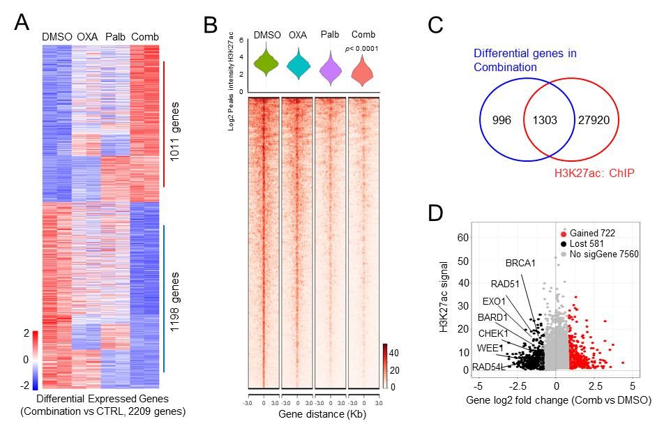 新輔助化療是目前臨床上治療局部晚期直腸癌的主要手段,但是約30%-60%的直腸癌患者對(duì)目前新輔助化療方案不敏感,腫瘤退縮較小或者甚至不退縮,然而臨床上又缺乏更多的藥物治療選擇,這群患者的術(shù)后輔助治療多是繼續(xù)沿用一線的化療方案,預(yù)后極差。為了探索腸癌新輔助化療耐藥的腫瘤分子特征,研究團(tuán)隊(duì)首先收集了結(jié)直腸癌腫瘤組織進(jìn)行轉(zhuǎn)錄組測(cè)序,再跟蹤隨訪病人化療效果,根據(jù)療效把病人分為化療敏感型和耐藥型,進(jìn)行分組分析。結(jié)果發(fā)現(xiàn)耐藥型腫瘤組織中細(xì)胞周期相關(guān)的信號(hào)異?;罨?,提示以“靶向異常的細(xì)胞周期檢查點(diǎn)”尋找治療靶點(diǎn)可能可以逆轉(zhuǎn)化療耐藥。于是進(jìn)一步利用小分子抑制劑文庫(kù)進(jìn)行高通量篩選,發(fā)現(xiàn)CDK4/6抑制劑可以有效提高奧沙利鉑敏感性,并且可以協(xié)同抑制腫瘤細(xì)胞增殖。機(jī)制上,通過整合全轉(zhuǎn)錄組測(cè)序分析和染色質(zhì)共沉淀測(cè)序分析發(fā)現(xiàn)CDK4/6抑制劑通過影響表觀遺傳修飾調(diào)控同源重組修復(fù)相關(guān)基因的表達(dá),從而解釋了CDK4/6抑制劑為何可以逆轉(zhuǎn)奧沙利鉑耐藥現(xiàn)象的機(jī)制,該研究有望為新輔助化療耐藥的直腸癌患者提供新的用藥選擇(圖1)。