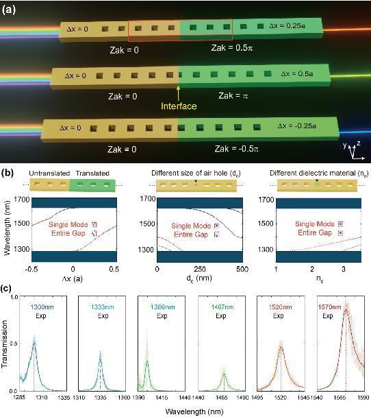研究團(tuán)隊(duì)將光子晶體納米橋中空氣孔的“平移參數(shù)”作為新的合成維度,提出了一種基于合成平移維度的片上拓?fù)涔庾泳w納米橋?yàn)V波器的設(shè)計(jì)方案。如圖1(a)所示,將不同平移量的光子晶體納米橋拼接形成拓?fù)涔庾泳w納米橋微腔。由于拼接處左右光子晶體具有不同的扎克相位(Zak phase),因此界面處支持局域腔模。進(jìn)一步改變拼接處右側(cè)光子晶體的平移量,從而實(shí)現(xiàn)了不同波長的光輸出?;诤铣善揭凭S度設(shè)計(jì)的拓?fù)涔庾泳w微腔相較于基于缺陷結(jié)構(gòu)的傳統(tǒng)光子晶體微腔具有多個(gè)優(yōu)勢(shì)。如圖1(b)所示,基于缺陷結(jié)構(gòu)的微腔存在腔模波長覆蓋范圍窄或非單波長濾波等問題。然而,基于合成平移維度的拓?fù)湮⑶唬ㄟ^空氣孔平移量的改變,微腔腔模可以覆蓋整個(gè)光子晶體禁帶帶隙(>300 nm,覆蓋光通信波段的大部分O波段,整個(gè)E,S,C波段以及大部分L波段)。且每個(gè)微腔僅支持單個(gè)腔模,可以實(shí)現(xiàn)單波長濾波。實(shí)驗(yàn)上,研究團(tuán)隊(duì)制備了具有不同平移量的片上拓?fù)涔庾泳w納米橋樣品,如圖1(c)所示的測(cè)量結(jié)果證實(shí)了片上拓?fù)涔庾泳w納米橋?yàn)V波器在寬波長范圍內(nèi)的選擇性單波長濾波。