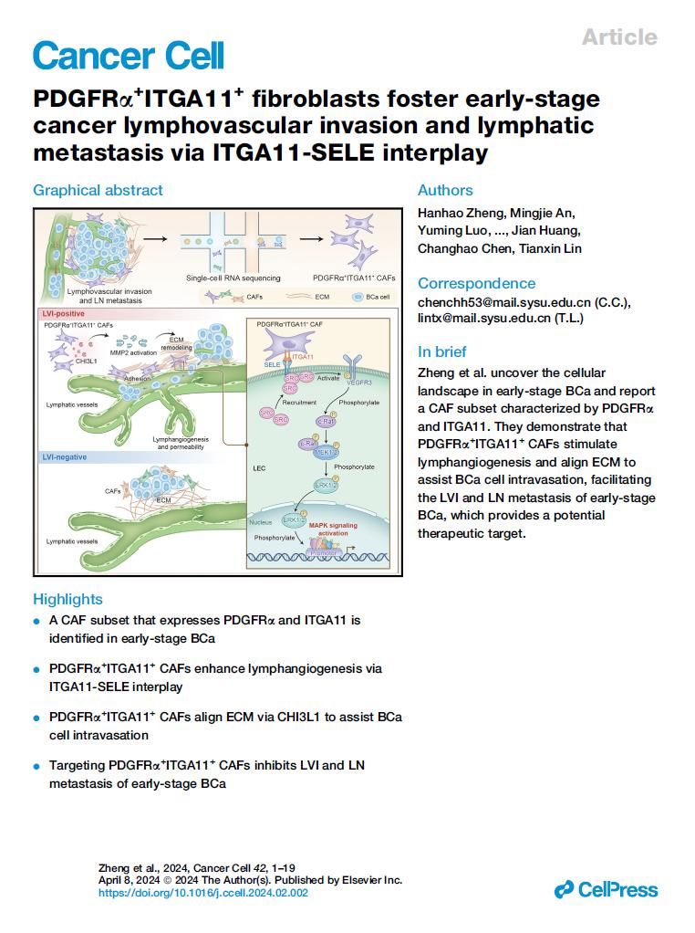 中大新聞網(wǎng)訊(通訊員林栩琪)淋巴轉(zhuǎn)移是影響膀胱癌預后的最主要因素之一。在臨床上,存在部分早期腫瘤負荷較小但卻出現(xiàn)淋巴轉(zhuǎn)移的膀胱癌,其預后極差,分子機制尚不清楚。近日,中山大學孫逸仙紀念醫(yī)院林天歆教授團隊揭示了腫瘤相關成纖維細胞亞群介導膀胱癌脈管癌栓形成的新機制,研究成果于2024年2月29日在國際頂級期刊《Cancer Cell》發(fā)表,題為“PDGFRα+ITGA11+ fibroblasts foster early-stage cancer lymphovascular invasion and lymphatic metastasis via ITGA11-SELE interplay”。