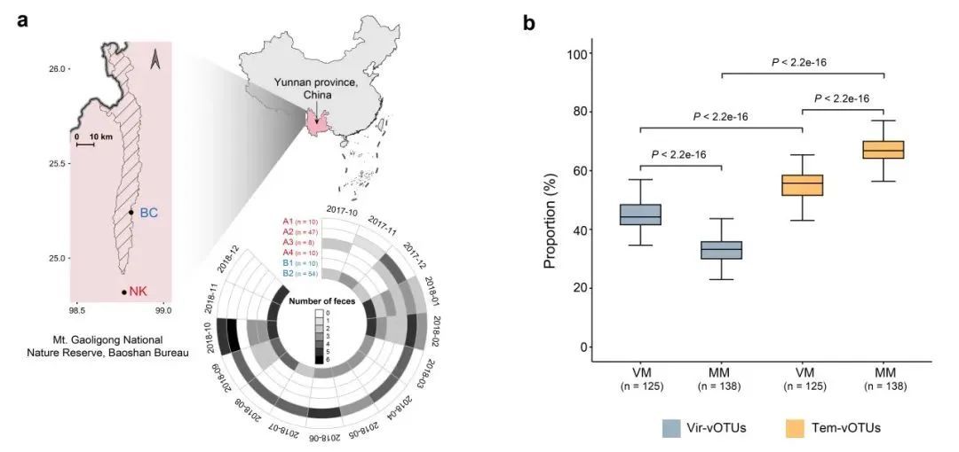 生命科學學院范朋飛教授團隊長期從事我國長臂猿的研究與保護工作,黃立南教授課題組長期從事微生物生態(tài)與進化研究。之前兩個課題組合作研究發(fā)現(xiàn),天行長臂猿腸道中原核微生物的季節(jié)性變化有助于天行長臂猿適應(yīng)高食葉比例(Li et al., 2023; https://doi.org/10.1038/s41522-023-00388-2)。然而,作為腸道微生物群落中的重要組成部分,腸道噬菌體群落對于天行長臂猿食性季節(jié)性變化的適應(yīng)機制還不清楚。