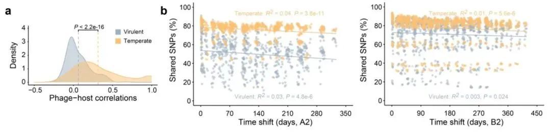 為了進一步探究兩種噬菌體的生態(tài)動力學背后的進化機制,研究人員分析了裂解型噬菌體和溫和型噬菌體與微生物宿主的互作模式。由于裂解型噬菌體更傾向于殺死宿主,而溫和型噬菌體與宿主一起復制,因此,相比于裂解型噬菌體,溫和型噬菌體的群落動態(tài)與原核微生物的群落動態(tài)聯(lián)系更加緊密,同時,宿主對于裂解型噬菌體具有更強的選擇壓力,進而導致裂解型噬菌體基因組上更快的SNP的丟失。對SNP位點的分析也顯示,裂解型噬菌體和溫和型噬菌體的SNP分別主要分布在與侵染宿主以及DNA復制有關(guān)的基因上。