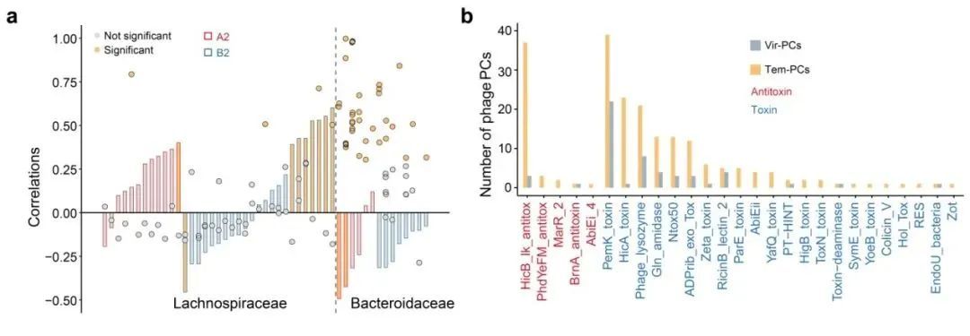 基于以上結(jié)果,研究人員分別使用病毒宏基因組和總宏基因組探究了裂解型噬菌體和溫和型噬菌體的群落動態(tài)。結(jié)果發(fā)現(xiàn),在長臂猿腸道中,對于高食葉比例進行響應(yīng)的噬菌體類群主要是寄生在毛螺菌科(Lachnospiraceae)微生物(與纖維素代謝功能有關(guān))的裂解型噬菌體,其只會部分殺死宿主(Cull-the-Host);而對于高食果比例進行響應(yīng)的噬菌體類群主要是寄生于擬桿菌科(Bacteroidaceae)微生物(與多糖水解發(fā)酵功能有關(guān))的溫和型噬菌體,其隨宿主進行復制(Piggyback-the-Host)。對兩種生活方式的噬菌體的功能進一步研究發(fā)現(xiàn),相比于裂解型噬菌體,溫和型噬菌體與原核微生物宿主間存在著更為廣泛的水平基因轉(zhuǎn)移,并且在天行長臂猿的高食葉期,溫和型噬菌體會顯著富集一些與原核微生物宿主適合度有關(guān)的毒性-抗毒性(TA)基因。