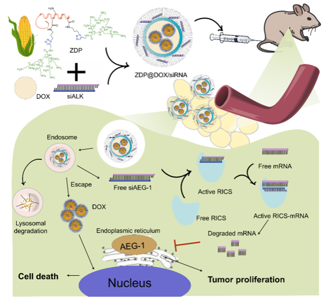 星形膠質(zhì)細(xì)胞升高基因-1 (AEG-1) 癌基因是包括骨肉瘤在內(nèi)的多種人類惡性腫瘤中一個(gè)臭名昭著且不斷發(fā)展的靶點(diǎn)。RNA干擾 (RNAi) 已被臨床證明可以有效地敲除特定基因。為了在體內(nèi)成功實(shí)施RNAi,保護(hù)載體不僅需要保護(hù)不穩(wěn)定的siRNAs不被降解,還需要將siRNAs以可控釋放的方式傳遞到靶細(xì)胞。為此,課題組合成了樹狀聚賴氨酸功能化玉米蛋白 (ZDP) 非病毒模塊化系統(tǒng),該系統(tǒng)可以在骨肉瘤中實(shí)現(xiàn)siRNA靶向的AEG-1基因沉默和抗腫瘤藥物的包封控釋。ZDP 的合理設(shè)計(jì)結(jié)合了玉米蛋白的非離子型、低免疫原性和樹狀聚賴氨酸 (DPLL) 的正電荷,通過靜電配合物包封siRNA和DOX有效載荷,在溶酶體酸性微環(huán)境中實(shí)現(xiàn)pH控制釋放。納米復(fù)合物的定向遞送在143B細(xì)胞中極大地提高了siRNA的穩(wěn)定性、攝取和AEG-1序列特異性敲除,其轉(zhuǎn)染效率與商用脂質(zhì)體相當(dāng),但具有更低的細(xì)胞毒性。這種以 AEG-1-focused RNAi 療法配合化療,抑制了143B細(xì)胞的增殖,誘導(dǎo)了143B細(xì)胞的凋亡,有效抑制了異種骨肉瘤小鼠模型的生長(zhǎng)。聯(lián)合治療是一種替代或組合策略,可以在骨肉瘤患者中產(chǎn)生持久的抑制反應(yīng)。