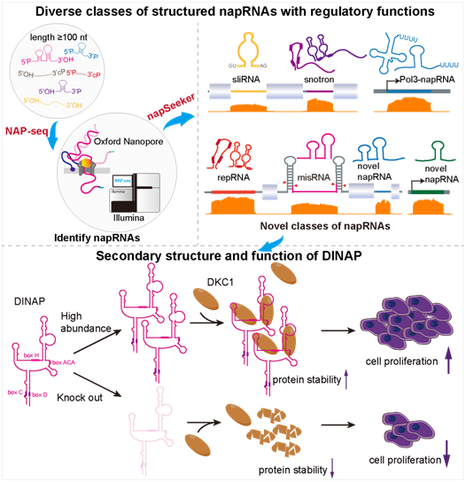 中大新聞網(wǎng)訊(通訊員熊麗娜)人類基因組是由約30 億個(gè)字符組成的遺傳“密碼本”,決定細(xì)胞和個(gè)體發(fā)育的命運(yùn)。該“密碼本”的98%字符都是具有“暗物質(zhì)”之稱的非編碼序列,而且約80%能夠轉(zhuǎn)錄成為 “暗物質(zhì)”核糖核酸(RNA)。這些“暗物質(zhì)”RNA大多數(shù)都是不具有帽子結(jié)構(gòu)的RNA(noncapped RNA,napRNA),且普遍作為非編碼RNA(ncRNA)在基因表達(dá)調(diào)控和疾病發(fā)生發(fā)展中扮演了重要角色。然而,目前的研究主要集中于具有帽子結(jié)構(gòu)的RNA(capped RNA,capRNA)和短的napRNA,人們對長的napRNA(序列長度≥100核苷酸)的種類組成、結(jié)構(gòu)、生物生成及功能機(jī)制都知之甚少。