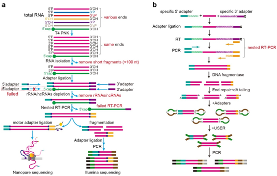 由于napRNA一般不具有polyA尾,因此傳統(tǒng)的利用PolyA富集的RNA-seq方法無法鑒定napRNA。即使是測定total RNA的RNA-seq方法,由于通過隨機(jī)六聚體引物對片段化的RNA進(jìn)行逆轉(zhuǎn)錄(RT)產(chǎn)生cDNA,也導(dǎo)致無法鑒定全長的napRNA序列和不能用于分類napRNA及不能用于確定其二級結(jié)構(gòu)等等。雖然通過小RNA測序(sRNA-seq)技術(shù)測定短napRNA發(fā)現(xiàn)了一些功能性小非編碼RNA(如:miRNA,piRNA),然而幾乎所有涉及sRNA-seq的研究都集中在小于50 核苷酸的napRNA,而不是各種長度和不同末端修飾的所有napRNA,尤其是長鏈(≥100 核苷酸)和結(jié)構(gòu)復(fù)雜的napRNA。針對這些問題,研究團(tuán)隊(duì)開發(fā)了一種捕獲長鏈napRNA的全長序列的新測序方法—NAP-seq,具體的簡化步驟包括:對RNA樣品進(jìn)行除雜、T4 PNK修復(fù)RNA末端、長度篩選、自主設(shè)計(jì)的3’端接頭和5’端接頭連接、非目標(biāo)RNA的去除、巢式RT-PCR與預(yù)擴(kuò)增、可選地片段化、在兩種不同的測序平臺(Oxford Nanopore三代單分子測序平臺和Illumina二代測序平臺)測序和開發(fā)新算法鑒定napRNA等步驟(圖1)。