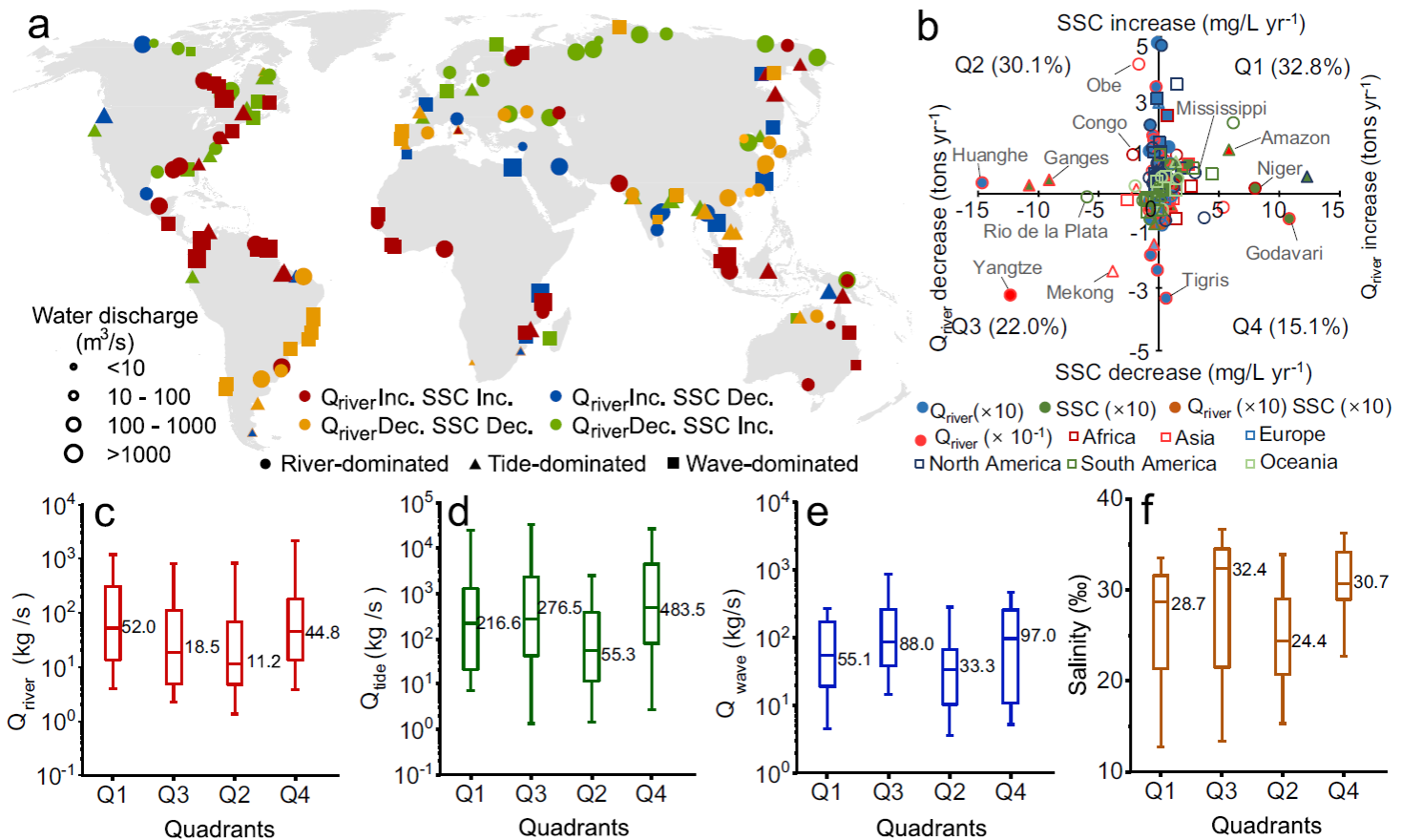 中大新聞網(wǎng)訊(通訊員侯雪姣)河流懸浮泥沙在維持河口三角洲濕地方面發(fā)揮著至關(guān)重要的作用。近幾十年來(lái),一些全球尺度的評(píng)估表明河流水壩的修建導(dǎo)致許多河流輸沙量減少,人們開(kāi)始擔(dān)憂河流輸沙減少會(huì)引起河口三角洲濕地退化。為了保護(hù)海岸帶濕地,一些學(xué)者提出拆除大壩以增加河流輸沙量,進(jìn)而改善河口的懸浮泥沙量。然而,目前全球河口三角洲沿岸懸浮泥沙的動(dòng)態(tài)及驅(qū)動(dòng)因素尚未得到全面評(píng)估,河口懸浮泥沙對(duì)河流輸沙變化的響應(yīng)仍然不清楚。