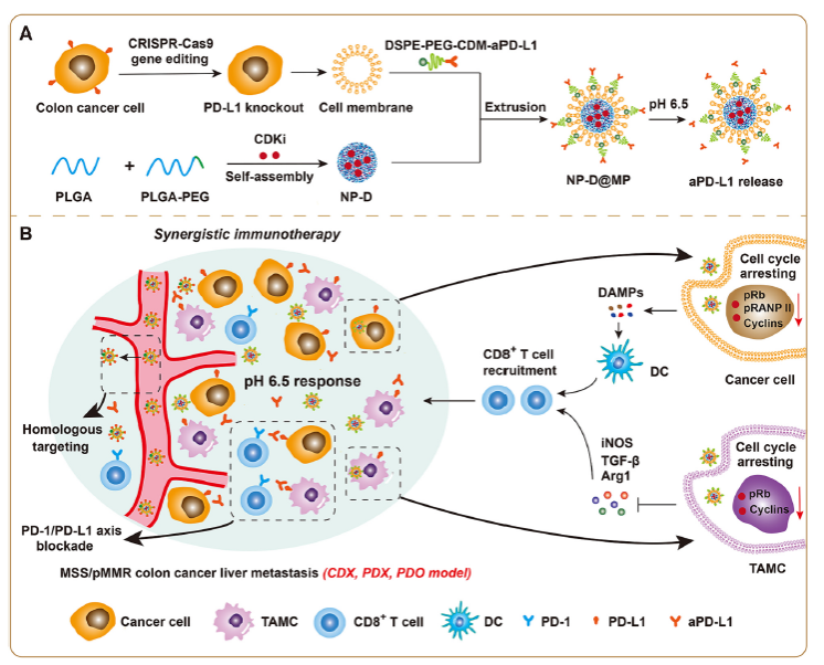 針對結(jié)腸癌肝轉(zhuǎn)移瘤的免疫抑制微環(huán)境,研究團(tuán)隊利用CRISPR-Cas9技術(shù)敲除腫瘤細(xì)胞膜表面PD-L1蛋白,提取細(xì)胞膜囊泡,并用其制備工程細(xì)胞細(xì)胞膜修飾的仿生納米藥物,共同遞送細(xì)胞周期蛋白依賴性激酶1/2/5/9抑制劑(CDKi)和PD-L1抗體。該納米藥物通過工程化細(xì)胞膜(CCM)介導(dǎo)的腫瘤同源靶向和PD-L1抗體介導(dǎo)的主動靶向?qū)崿F(xiàn)肝轉(zhuǎn)移瘤的精準(zhǔn)遞送,靶向腫瘤微環(huán)境中的癌細(xì)胞及腫瘤相關(guān)髓系細(xì)胞(TAMC),捕獲G2/M細(xì)胞周期,誘導(dǎo)癌細(xì)胞免疫原性死亡,促進(jìn)CD8+ T細(xì)胞浸潤,將“冷”腫瘤轉(zhuǎn)變?yōu)椤盁帷蹦[瘤;同時,抑制TAMC,逆轉(zhuǎn)免疫抑制微環(huán)境,增敏MSS/pMMR結(jié)腸癌肝轉(zhuǎn)移的ICB治療效果。該靶向治療體系在結(jié)腸癌肝轉(zhuǎn)移(PDX)模型及人源類器官模型中具有同樣的協(xié)同免疫治療效果。