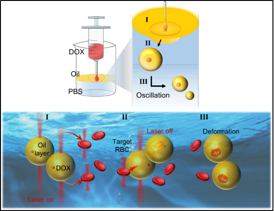 基于此,中山大學(xué)材料科學(xué)與工程學(xué)院雷宏香教授、楊國偉教授團(tuán)隊提出了一種基于掃描光鑷的新型靶向藥物遞送系統(tǒng),成功解決了以上難點。具體設(shè)計為,首先采用簡單的注射擠壓法制備了尺寸可控的油包水核殼結(jié)構(gòu)載藥微液滴(藥滴位于內(nèi)核,且載藥量可控),并借助掃描光鑷技術(shù)實現(xiàn)了載藥微液滴的穩(wěn)定捕獲和靶向輸送,確保了在靶向藥物輸運的過程中無藥物泄露且無任何外源性材料和熱損傷的引入;接著通過設(shè)計不同的靜態(tài)和動態(tài)光阱,巧妙將一個或多個目標(biāo)細(xì)胞在光力的誘導(dǎo)下推入載藥微液滴中,形成包覆藥滴和目標(biāo)細(xì)胞的復(fù)合微液滴結(jié)構(gòu),在保護(hù)外部其他細(xì)胞的同時也為目標(biāo)細(xì)胞的治療提供高純的藥物環(huán)境,從而實現(xiàn)了精確的給藥;通過合理設(shè)計載藥量還可以實現(xiàn)定量的給藥,從而獲得高效的藥物利用率。