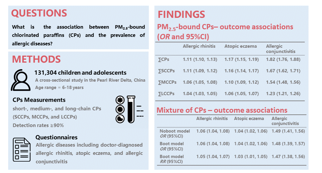 中大新聞網(wǎng)訊(通訊員黃靖雯)近日,公共衛(wèi)生學院董光輝教授課題組在國際期刊Journal of Hazardous Materials(中科院一區(qū),IF=13.6)上發(fā)表了題為Positive Association between Chlorinated Paraffins and the Risk of Allergic Diseases in Children and Adolescents的最新研究成果。本研究在前期研究基礎上深入拓展,為推進新型持久性有機污染物氯化石蠟的健康風險評估和相關管理提供了新的人群研究證據(jù)。