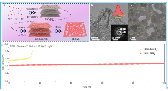 該研究表明,催化劑中豐富的晶界能夠引發(fā)顯著的拉伸應變并創(chuàng)造出不飽和的配位環(huán)境,不僅能夠有效地穩(wěn)定晶體結構,同時還增強了其對氧中間體的吸附能力。最終,GB-RuO2表現(xiàn)出低過電勢(η10= 187 mV)和超低塔菲爾斜率(34.5 mV dec-1),并且在 0.1 M HClO4 中穩(wěn)定運行超過 550 小時。以 GB-RuO2 催化劑為陽極的質子交換膜水電解槽在 2 A cm-2 的電流密度下運行電壓僅為 1.669 V,并在 100 mA cm-2的電流密度下可以穩(wěn)定運行 100 小時,表現(xiàn)出極高的活性和良好的穩(wěn)定性。