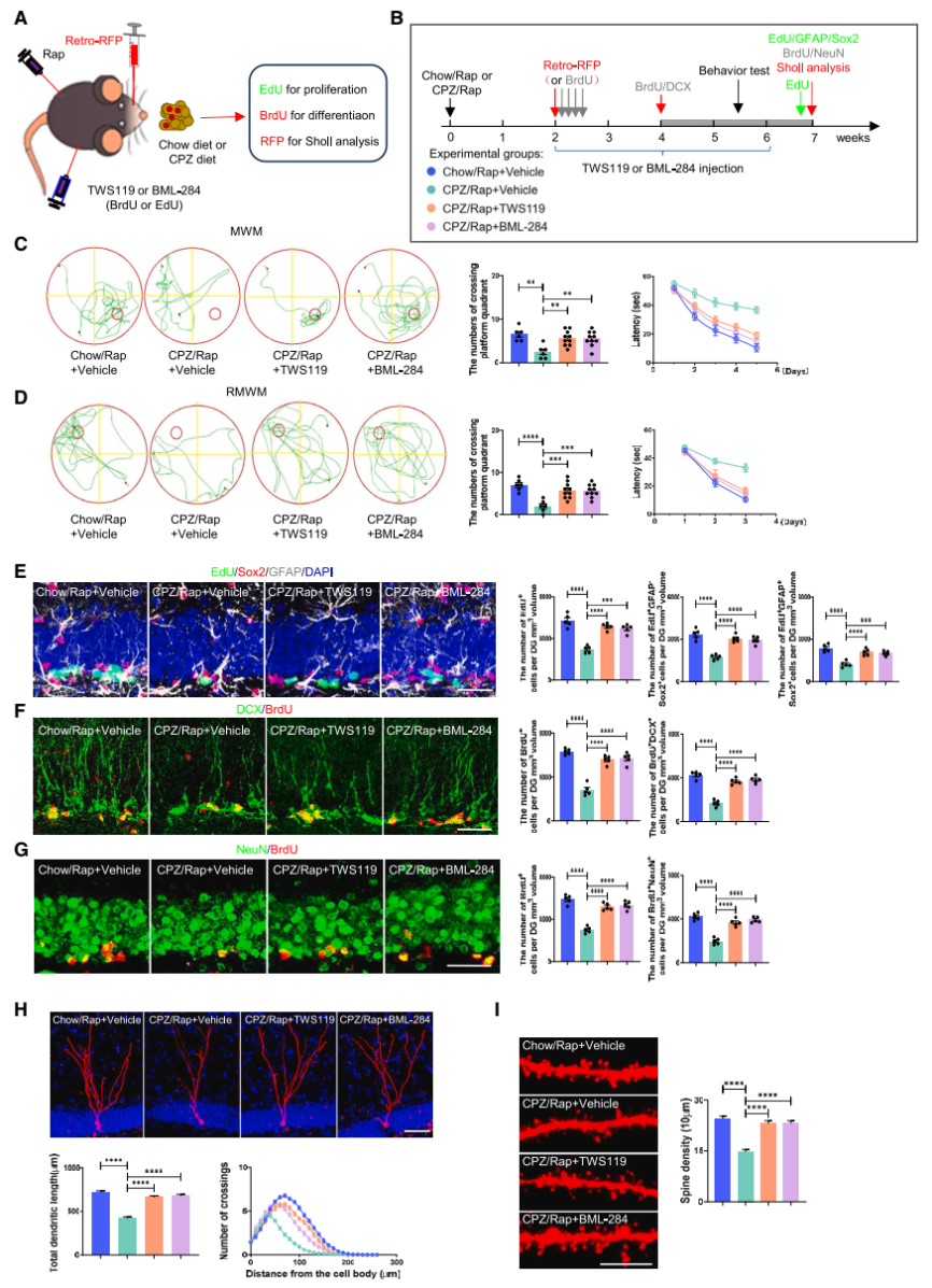 在脫髓鞘海馬中,神經(jīng)干細(xì)胞的分化、新生神經(jīng)元的發(fā)育和功能連接受到抑制。團(tuán)隊發(fā)現(xiàn)CPZ/Rap小鼠海馬內(nèi)未成熟神經(jīng)元和成熟神經(jīng)元的細(xì)胞數(shù)量減少,RFP+新生神經(jīng)元的樹突長度、復(fù)雜度和新生神經(jīng)元之間的連接受損,證實CPZ/Rap抑制了NSCs的分化和新生神經(jīng)元的發(fā)育和功能連接(圖2)。