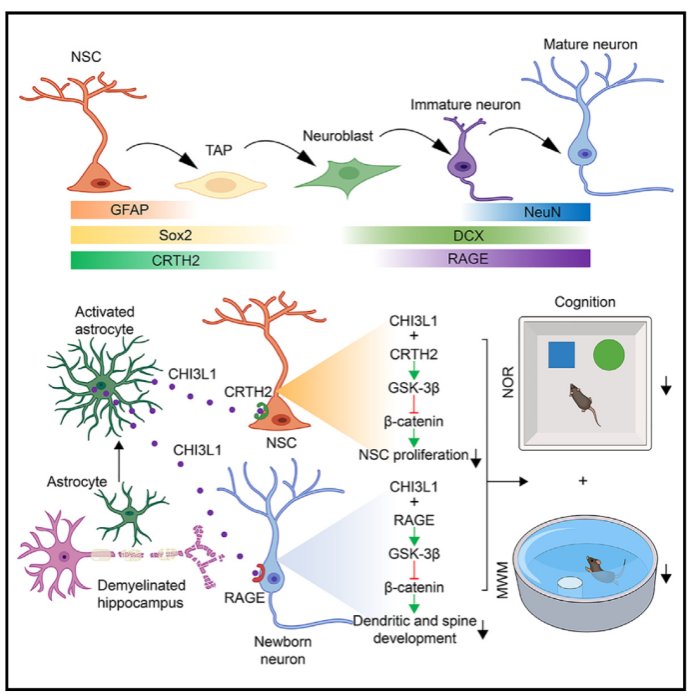 近日,中山大學(xué)附屬第三醫(yī)院腦病中心邱偉/湯常永團(tuán)隊在國際知名期刊Cell Reports發(fā)表了題為“Astrocyte-derived CHI3L1 signalling impairs neurogenesis and cognition in the demyelinated hippocampus”的研究論文,揭示了星形膠質(zhì)細(xì)胞來源的CHI3L1通過CRTH2/RAGE-β-catenin信號通路參與調(diào)控脫髓鞘海馬的神經(jīng)發(fā)生和認(rèn)知功能。