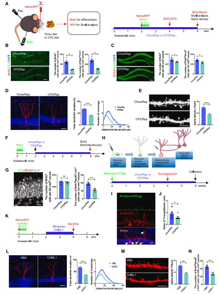 圖2 CPZ/Rap給藥或CHI3L1過表達(dá)對海馬新生神經(jīng)元發(fā)育和功能連接的影響
