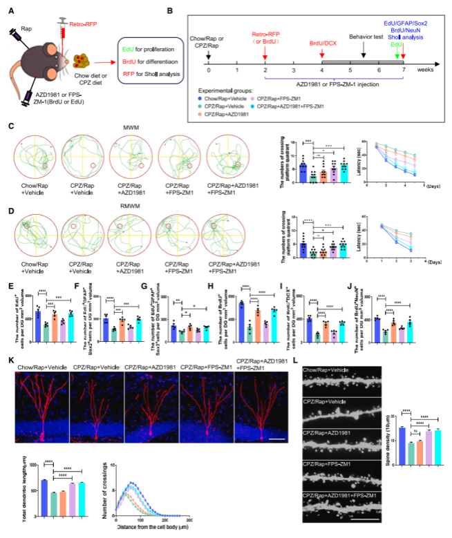 圖3 星形膠質(zhì)細(xì)胞Chil1的缺失對CPZ/Rap小鼠成年海馬神經(jīng)發(fā)生、新生神經(jīng)元發(fā)育和認(rèn)知功能的影響