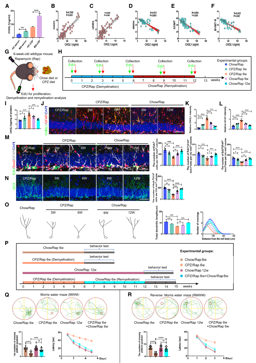 在脫髓鞘和再髓鞘海馬中,CHI3L1水平、海馬神經(jīng)發(fā)生和認(rèn)知功能呈動態(tài)改變。團(tuán)隊發(fā)現(xiàn),相較于健康對照者, MS患者血清和腦脊液中CHI3L1水平明顯升高,血清中CHI3L1含量與認(rèn)知功能評分呈負(fù)相關(guān)。另外,在雙環(huán)己酮草酰二腙/蕾帕霉素(CPZ/Rap)誘導(dǎo)的脫髓鞘海馬中,激活的星形膠質(zhì)細(xì)胞內(nèi)CHI3L1的表達(dá)逐漸上調(diào),神經(jīng)干細(xì)胞(neural stem cells, NSCs)的數(shù)量逐漸減少,神經(jīng)元的樹突長度和復(fù)雜度逐漸下降,學(xué)習(xí)行為受到明顯抑制,而這些改變在再髓鞘過程中得以逆轉(zhuǎn)(圖1)。