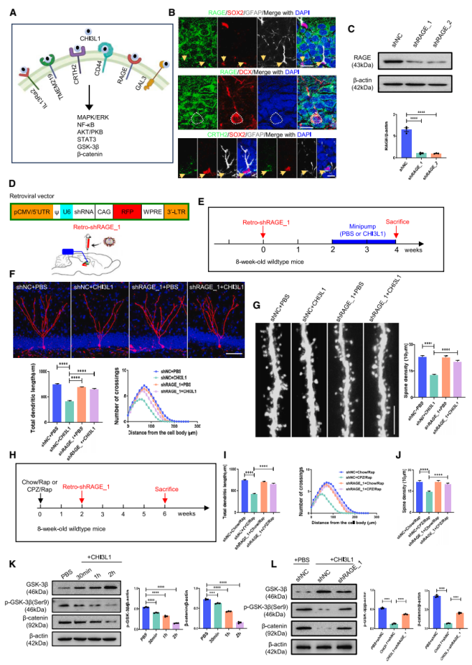 CHI3L1與RAGE受體結(jié)合,通過減少β-Catenin信號傳導(dǎo)抑制海馬神經(jīng)元發(fā)育。研究發(fā)現(xiàn)敲降RAGE能挽救CHI3L1過表達(dá)和CPZ/Rap干預(yù)條件下的新生神經(jīng)元發(fā)育異常。此外,調(diào)控CHI3L1/RAGE/β-catenin信號通路可以改善MS小鼠模型中新生神經(jīng)元的發(fā)育缺陷(圖4)。