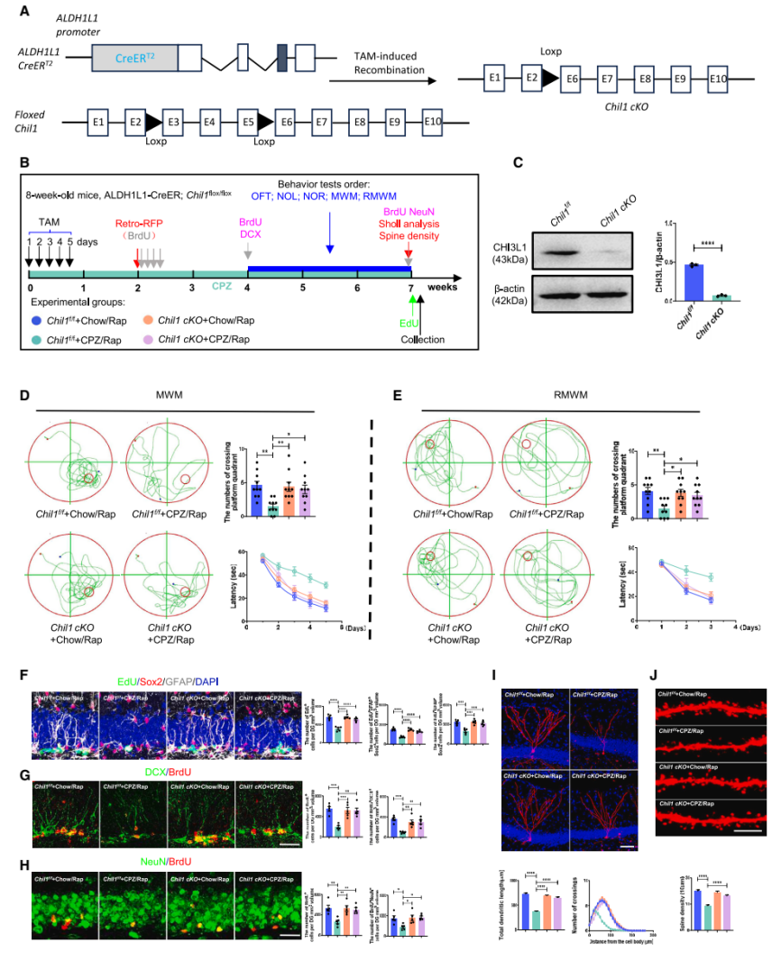 星形膠質(zhì)細(xì)胞內(nèi)特異性敲除Chil1可改善脫髓鞘海馬的神經(jīng)發(fā)生缺陷及認(rèn)知功能障礙。團(tuán)隊?wèi)?yīng)用ALDH1L1-CreERT2;Chilflox/flox(Chil cKO)小鼠,發(fā)現(xiàn)Chil cKO逆轉(zhuǎn)了CPZ/Rap處理對NSCs增殖分化、新生神經(jīng)元發(fā)育和認(rèn)知功能造成的損害作用(圖3)。