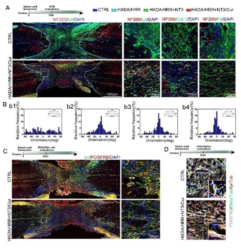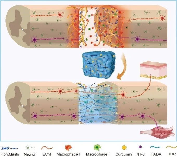 圖1:HADA/HRR+NT3/Cur水凝膠重塑細(xì)胞外基質(zhì)重建上下行神經(jīng)聯(lián)系