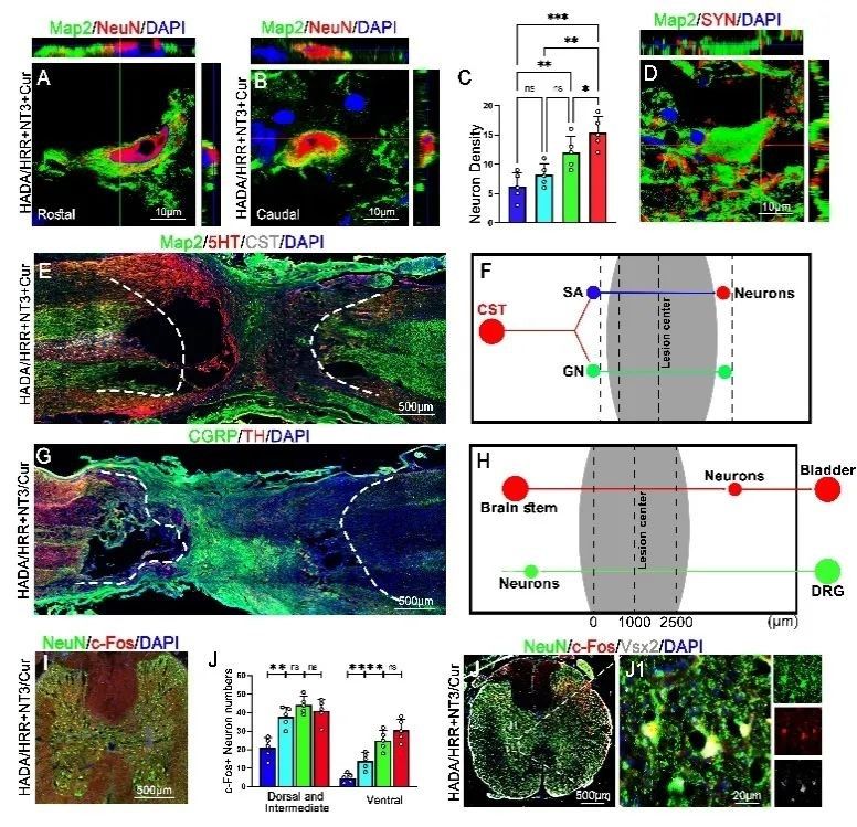 在該研究中,HADA/HRR+NT3/Cur水凝膠促進(jìn)了損傷邊界中間神經(jīng)元的存活。這些激活的中間神經(jīng)元作為中繼站,與中斷的上下行神經(jīng)纖維形成了異質(zhì)性突觸結(jié)構(gòu),實(shí)現(xiàn)神經(jīng)聯(lián)系的“精準(zhǔn)”重建,促進(jìn)了運(yùn)動(dòng)、感覺和膀胱功能恢復(fù)。