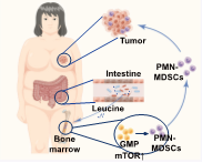 中大新聞網(wǎng)訊(通訊員熊麗娜)全球包括中國人群的高脂肪攝入量和肥胖率正快速上升。目前,高脂飲?(HFD)和肥胖已被認為是一些惡性腫瘤的高危因素。高脂飲食可通過破壞腸道菌群平衡導致癌癥惡性發(fā)展。然而,與HFD相關腸道菌群在癌癥進展中的作用仍不清楚。在該論文中,作者們對5031例患者數(shù)據(jù)的分析發(fā)現(xiàn)肥胖和肥胖相關腸道菌群與乳腺癌女性患者的不良預后和晚期臨床病理狀態(tài)相關。為闡明HFD相關腸道菌群在癌癥進展中的作用,作者們對高脂飲食條件下的荷瘤小鼠開展了糞菌轉(zhuǎn)移等系列實驗,證明失衡的HFD腸道菌群上調(diào)了血清中支鏈氨基酸尤其是亮氨酸的水平,亮氨酸激活了骨髓中髓系祖細胞的mTORC1信號通路,促發(fā)多形核髓源性抑制細胞(PMN-MDSCs)的分化,進而促進了癌癥發(fā)展;進一步發(fā)現(xiàn)脫硫弧菌屬細菌( Desulfovibrio)在超重/肥胖癥患者的糞便中富集,并與腫瘤增長、糞便亮氨酸水平和PMN-MDSCs 水平正相關,無菌動物菌株灌胃實驗的結(jié)果也驗證了上述發(fā)現(xiàn),表明脫硫弧菌是驅(qū)動癌癥進展的腸道菌群中的關鍵類群。最后,作者們發(fā)現(xiàn) HFD菌群誘導的外周血亮氨酸水平升高與女性乳腺癌患者腫瘤PMN-MDSC浸潤豐富及臨床預后差相關。以上結(jié)果揭示“腸道-骨髓-腫瘤”軸參與了HFD介導的癌癥發(fā)展,為靶向調(diào)控腸道菌群-宿主共代謝物干預癌癥發(fā)展提供了新的策略。