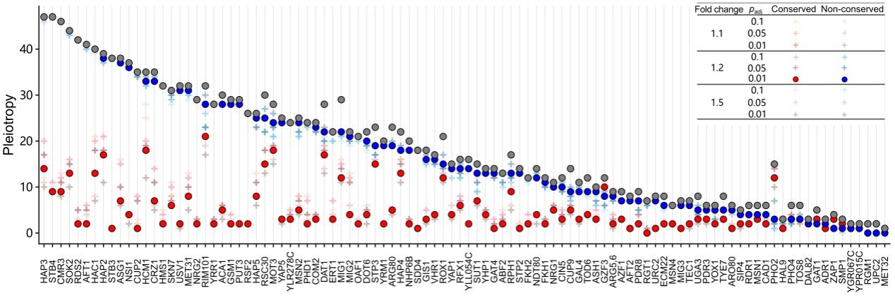 為了驗(yàn)證這一假設(shè),研究人員進(jìn)一步研究了由兩個(gè)菌株的約1000個(gè)雜交后代組成的群體中遺傳變異的多效性效應(yīng)。他們觀察到,新進(jìn)化的表達(dá)數(shù)量性狀位點(diǎn)(eQTL)比古老的eQTL影響更多基因的表達(dá)。這表明自然選擇正在逐漸消除適應(yīng)不良或輕微有害的多效性反應(yīng)。