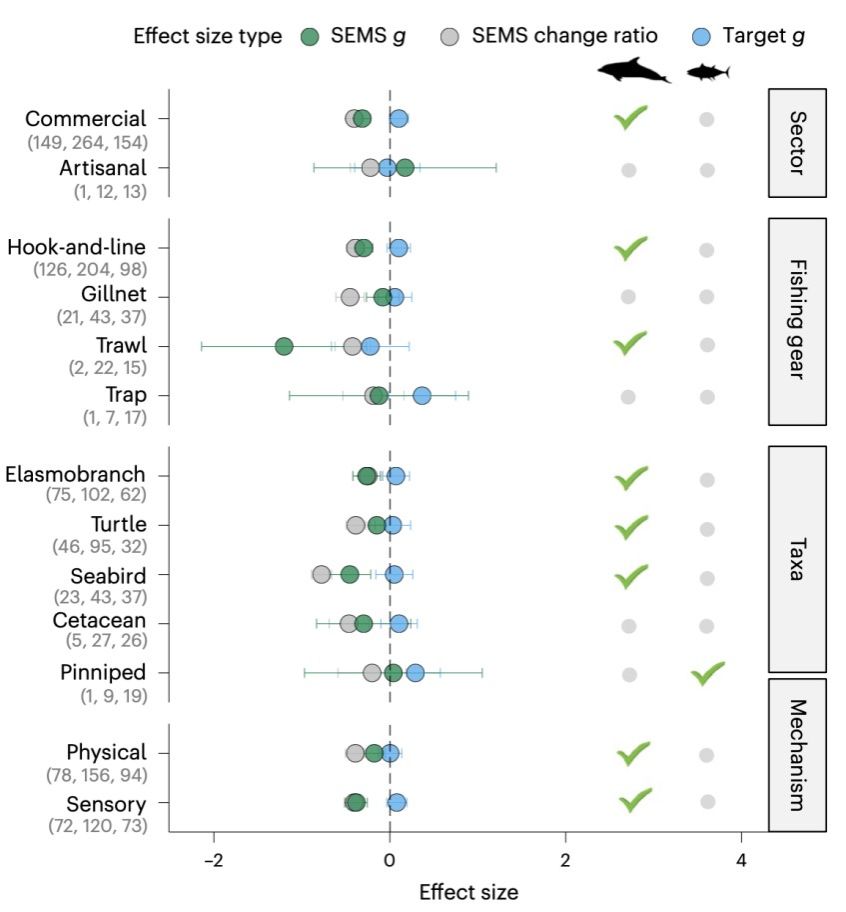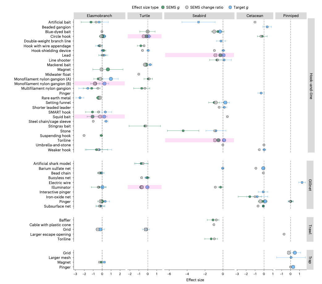 近日,由中山大學(xué)生態(tài)學(xué)院和水產(chǎn)動物疫病防控與健康養(yǎng)殖全國重點實驗室領(lǐng)銜的國際團(tuán)隊在環(huán)境科學(xué)與生態(tài)學(xué)領(lǐng)域頂級期刊Nature Sustainability發(fā)表題為“Effects of fishery bycatch-mitigation measures on vulnerable marine fauna and target catch”的研究論文。該研究在全球尺度,系統(tǒng)性量化評估了減少誤捕的技術(shù)性措施對漁業(yè)的目標(biāo)漁獲以及脆弱海洋動物的影響。該研究發(fā)現(xiàn):總體來看,這些技術(shù)性措施可顯著減少捕撈作業(yè)對脆弱海洋動物的誤捕事件,同時對目標(biāo)漁獲無顯著影響。