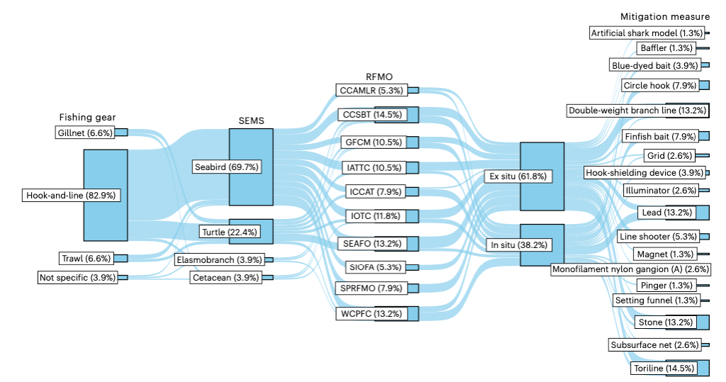 減少漁業(yè)對脆弱海洋動物的誤捕有助于實現(xiàn)多個昆明-蒙特利爾全球生物多樣性框架目標(biāo)(如目標(biāo)4)和可持發(fā)展目標(biāo)(如水下生命,Life Under Water)。本研究基于大量實驗研究,首次在全球尺度評估了現(xiàn)有技術(shù)性措施的成效及其被區(qū)域性漁業(yè)管理組織的采納情況。同時,本研究認(rèn)為其他措施也十分重要,如捕撈操作性措施、應(yīng)急處理放歸措施、漁業(yè)貿(mào)易禁令和管控條例。在實踐中,這些措施可以集成在“預(yù)防-減少-修復(fù)-補償”的大框架下,產(chǎn)生協(xié)同的效應(yīng)。