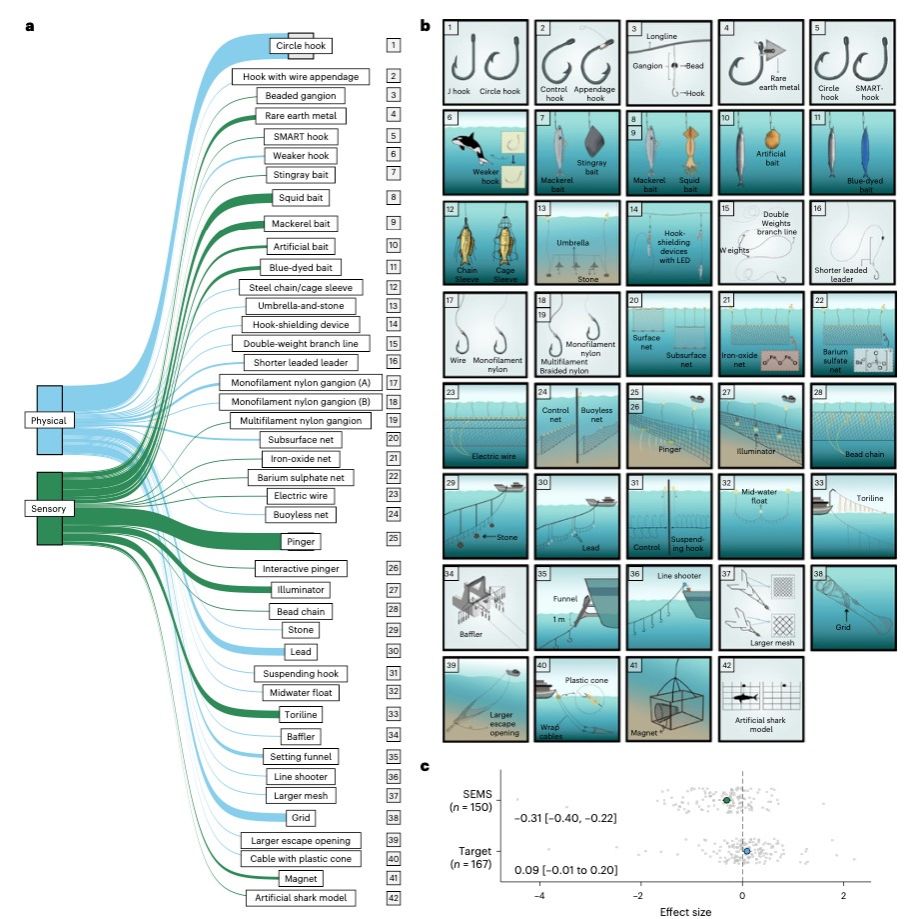 本研究針對減少脆弱海洋動物誤捕的技術(shù)性措施,基于公開實驗研究,構(gòu)建了全球性數(shù)據(jù)集,采用薈萃分析方法,系統(tǒng)性量化評估了42種措施(圖1a.b)對目標(biāo)漁獲和脆弱海洋動物誤捕的影響。