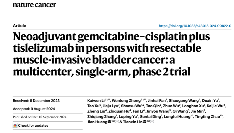 近日,中山大學(xué)孫逸仙紀念醫(yī)院林天歆教授和黃健教授領(lǐng)銜的國內(nèi)多中心臨床研究(BGB-A317-2002)探討了替雷利珠單抗聯(lián)合吉西他濱/順鉑新輔助治療中國MIBC患者的療效、安全性及潛在的預(yù)測性生物標(biāo)志物。這項研究為中國MIBC患者的治療提供了重要的循證醫(yī)學(xué)支持,并于2024年9月10日,在國際頂級期刊《Nature Cancer》上,發(fā)表了題為《Neoadjuvant gemcitabine–cisplatin plus tislelizumab in persons with resectable muscle-invasive bladder cancer: a multicenter, single-arm, phase 2 trial”》的論文。該論文的通訊作者為林天歆、黃健教授,李鍇文副主任醫(yī)師和鐘文龍主治醫(yī)師為共同第一作者。