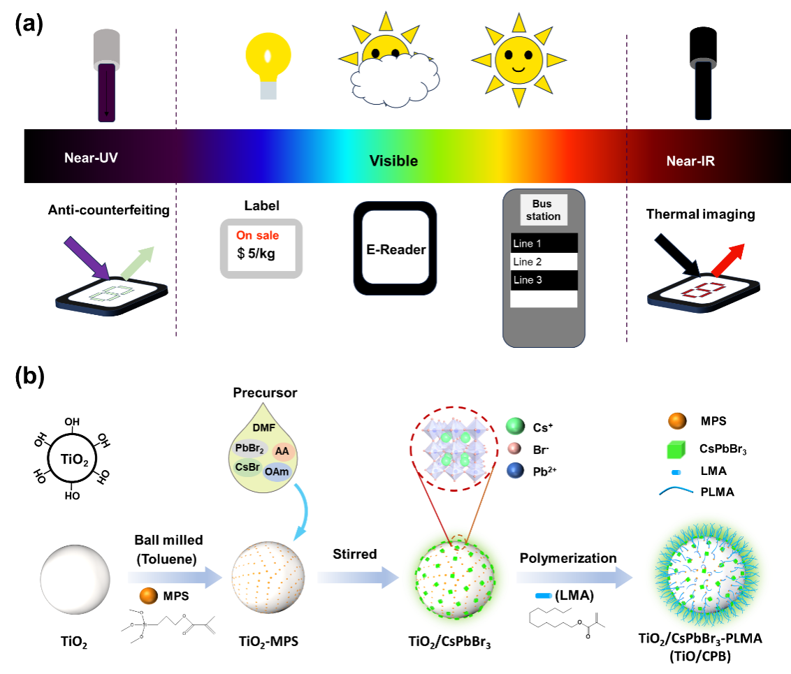 中大新聞網(wǎng)訊(通訊員林銳娜)傳統(tǒng)的光學(xué)防偽技術(shù)大多依賴于靜態(tài)印刷圖像,安全性較低,因此需要開(kāi)發(fā)具有動(dòng)態(tài)調(diào)制圖案功能的新型防偽設(shè)備。近日,中山大學(xué)楊柏儒教授團(tuán)隊(duì)開(kāi)發(fā)出了一種新型熒光電泳顯示(EPD)技術(shù)。該團(tuán)隊(duì)通過(guò)在傳統(tǒng)的電泳粒子TiO?上復(fù)合鈣鈦礦量子點(diǎn)(CsPbBr?),制備了具備熒光特性的電泳粒子,并進(jìn)一步研制了一種多功能防偽器件。該器件不僅響應(yīng)快速、對(duì)比度高,而且能夠呈現(xiàn)明亮的綠色熒光,為未來(lái)的動(dòng)態(tài)防偽和識(shí)別提供了新思路。這項(xiàng)研究成果以題為“Fluorescent, multifunctional anti-counterfeiting, fast response electrophoretic display based on TiO2/CsPbBr3 composite particles”發(fā)表在《Light: Science & Applications》期刊上,楊柏儒教授為通訊作者,博士生劉廣友為第一作者。此項(xiàng)研究得到了國(guó)家重點(diǎn)研發(fā)計(jì)劃、科技部項(xiàng)目、廣東省重點(diǎn)地區(qū)研發(fā)計(jì)劃等項(xiàng)目的支持。