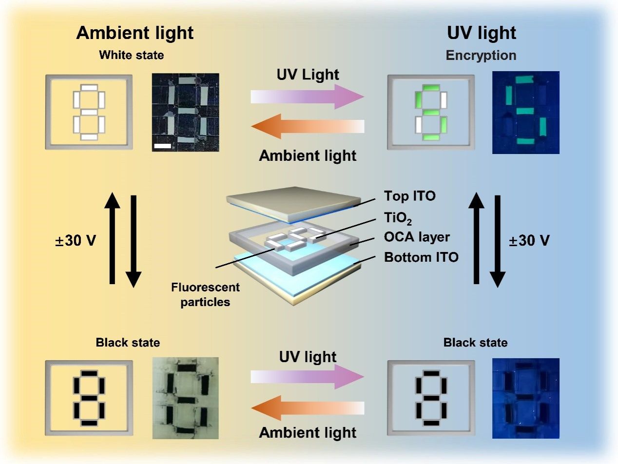 研究團(tuán)隊(duì)基于熒光電泳顯示器制備了防偽顯示器件,該防偽器件采用多層結(jié)構(gòu)設(shè)計(jì),由頂部和底部ITO層以及帶有圖案化的OCA層組成。通過(guò)在數(shù)字“8”圖案中的數(shù)字“5”區(qū)域填充熒光電泳分散液,而在其他區(qū)域填充普通電泳分散液,在可見(jiàn)光下,該EPD能夠在30V電壓下實(shí)現(xiàn)黑白數(shù)字“8”的切換。當(dāng)白色粒子被驅(qū)動(dòng)到ITO頂層時(shí),可以通過(guò)切換紫外光,實(shí)現(xiàn)數(shù)字“5”圖案的綠色狀態(tài)和數(shù)字“8”圖案的白色狀態(tài)。熒光EPD技術(shù)拓展了EPD在動(dòng)態(tài)防偽與多功能顯示上的應(yīng)用,有效提升了防偽安全性。該動(dòng)態(tài)防偽器件在電場(chǎng)和紫外光照下可以實(shí)現(xiàn)其雙模式顯示,未來(lái)可以應(yīng)用于智能防偽器件中。該器件具備快速響應(yīng)、通過(guò)控制電場(chǎng)和紫外光實(shí)現(xiàn)防偽設(shè)備的隱私可控、智能化、多功能動(dòng)態(tài)顯示等特點(diǎn),具有相對(duì)較高的保密性。未來(lái),該技術(shù)有望應(yīng)用于更多顯示器件領(lǐng)域,通過(guò)集成商業(yè)化的驅(qū)動(dòng)電路,如無(wú)源矩陣(PM)或有源矩陣(AM),進(jìn)一步提升其應(yīng)用廣度和安全性。