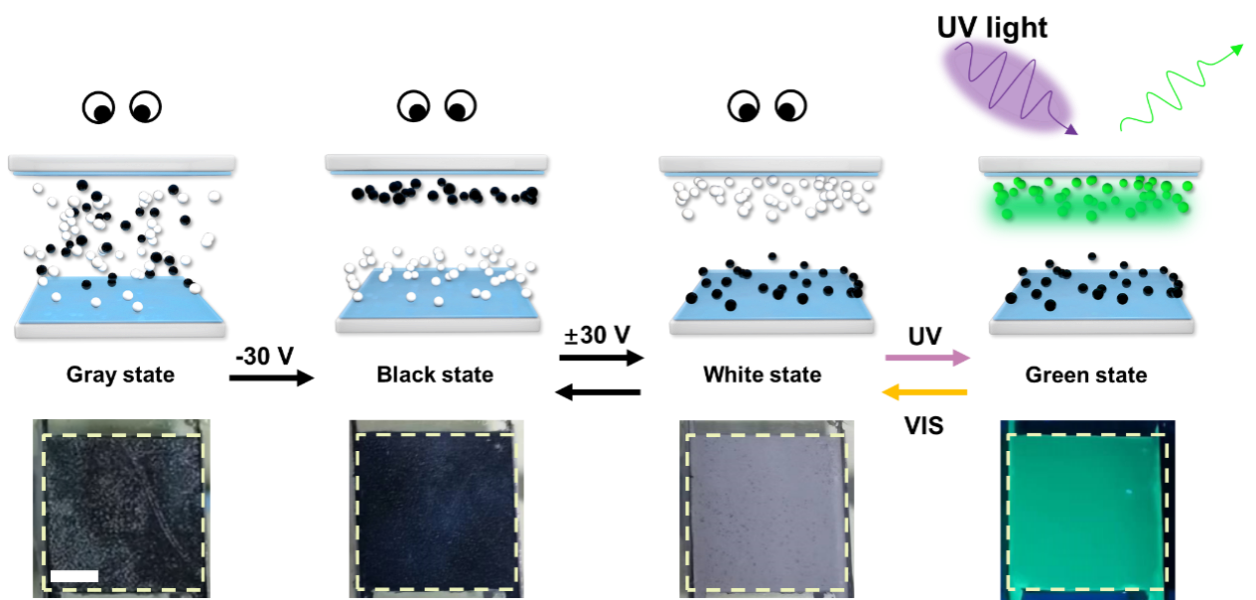 圖3.熒光EPD在白、綠、黑三種狀態(tài)下的原理圖和照片。比例尺:1厘米