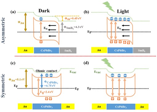 圖4. 非對稱電極型Au/CsPbBr3/SmB6器件和對稱電極型Au/CsPbBr3/Au器件在明暗條件的能帶圖