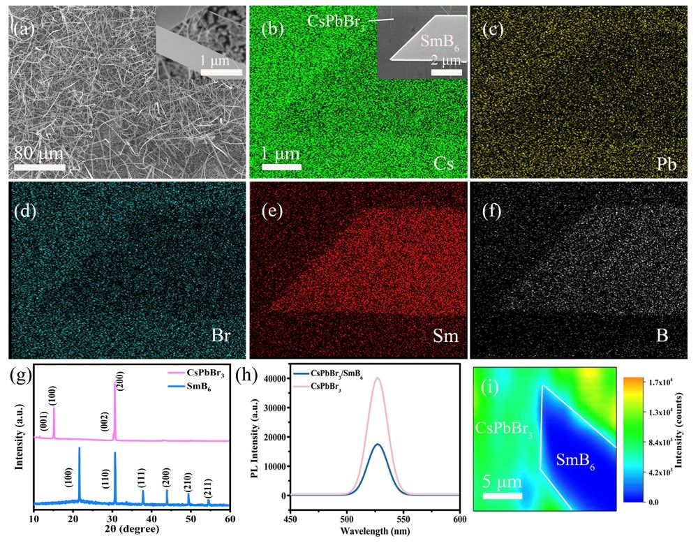 圖2. CsPbBr3/SmB6肖特基的表面形貌、結(jié)構(gòu)表征和熒光發(fā)光特性