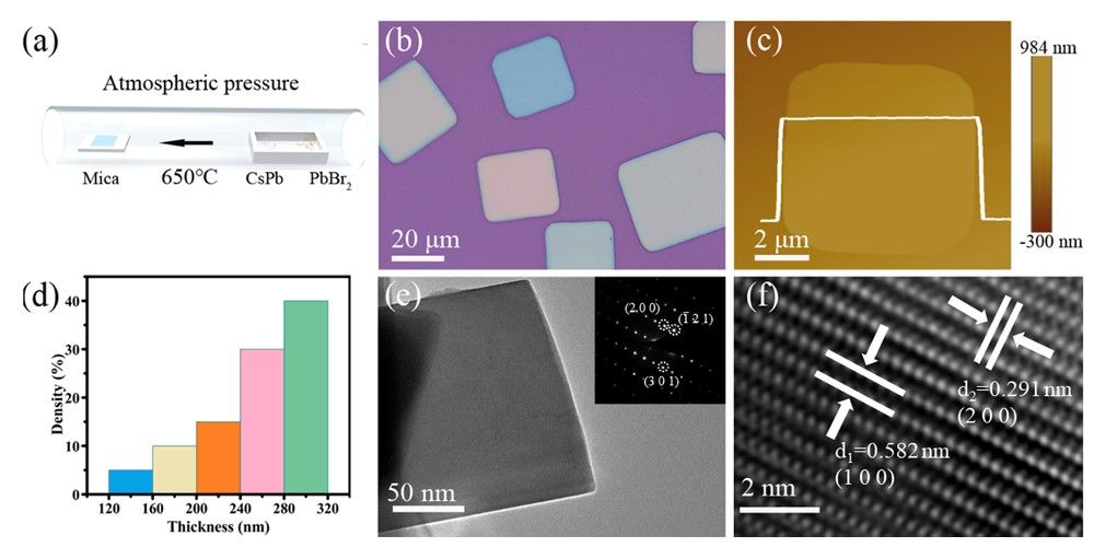 圖1. APCVD法所制備的CsPbBr3微米方片的形貌和晶格結(jié)構(gòu)