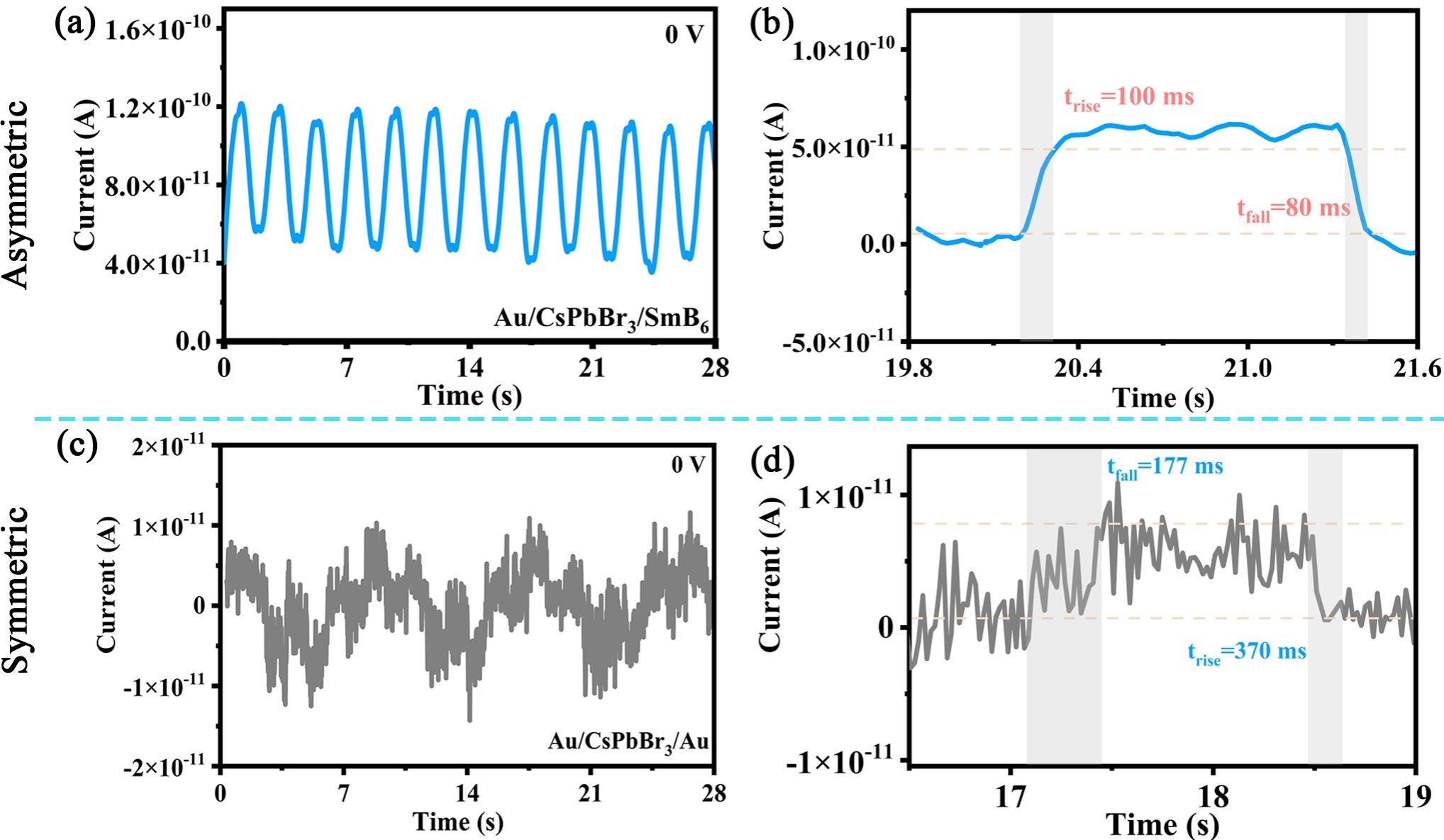 圖3. 非對稱電極型Au/CsPbBr3/SmB6器件和對稱電極型Au/CsPbBr3/Au器件在零偏壓下的時間響應曲線