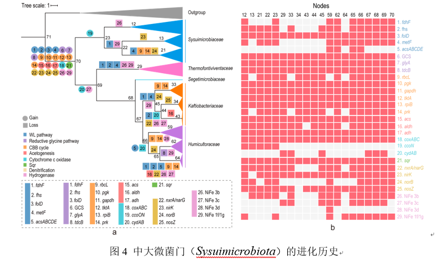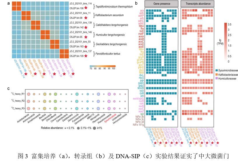 本研究從熱泉原始樣品的宏基因組數(shù)據(jù)中重構(gòu)了CSP1-3類群的基因組,結(jié)合NCBI數(shù)據(jù)庫中的基因組,最終選取112條完整度大于80%,污染度小于5%的CSP1-3類群基因組進行分析。系統(tǒng)發(fā)育結(jié)果顯示,這112條基因組所代表的菌株屬于同一門,可劃分為5個不同的科,11個屬和25個種(圖1)。這些基因組所代表的菌株廣泛分布于世界各地,土壤和熱泉是適合該類群生存的生境(圖1)?;蚪M分析結(jié)果顯示,該門類群的菌株是兼性厭氧微生物,能通過還原性甘氨酸途徑(RGP)、卡爾文循環(huán)(CBB)和伍德-永達爾通路(WLP)進行碳固定實現(xiàn)自養(yǎng)生長,氫化酶的存在及硫化物的氧化是自養(yǎng)生長過程中主要的能量來源(圖2)。采用自養(yǎng)培養(yǎng)基在厭氧條件下對CSP1-3類群進行富集,熒光原位雜交(FISH)實驗及擴增子結(jié)果顯示,CSP1-3類群被成功富集且豐度有明顯的提高。同時,宏轉(zhuǎn)錄組及穩(wěn)定同位素核酸探針(DNA-SIP)技術(shù)分析結(jié)果進一步證實了CSP1-3類群的化能自養(yǎng)功能(圖3)。進化分析表明,CSP1-3類群的祖先能通過RGP進行自養(yǎng)生長并產(chǎn)生乙酸,且該功能在該門類群之間進行垂直傳遞,而CBB、WLP和反硝化功能則是通過不同的水平基因轉(zhuǎn)移事件獲得(圖4)。最終,本研究將該門類群命名為中大微菌門(Sysuimicrobiota phy. nov.)。該研究通過多組學技術(shù)和富集培養(yǎng)手段,系統(tǒng)深入地探究了中大微菌門的多樣性,空間分布格局,參與的生態(tài)功能角色和進化歷史,拓展了對未培養(yǎng)細菌的認知,完善了熱泉微生物生態(tài)功能過程理論,也為極端環(huán)境微生物新資源的挖掘提供了一種可能的思路和策略。