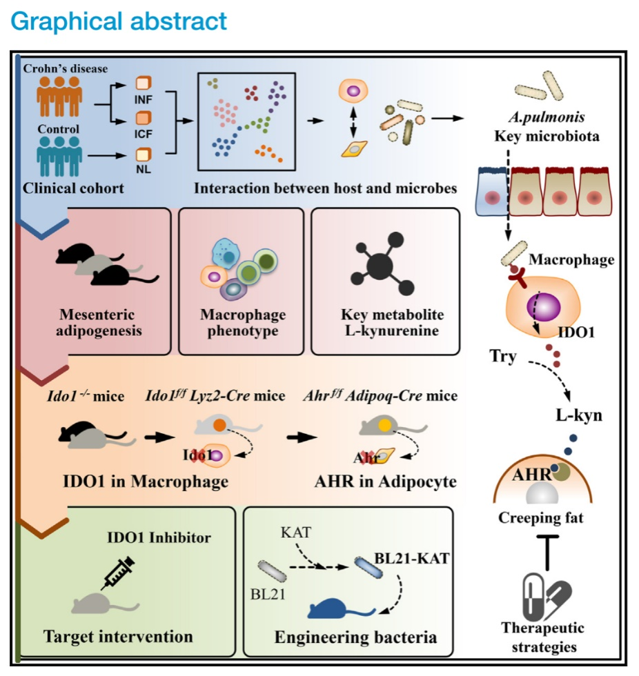 腸道微生物組成和功能的改變是導致CD發(fā)生發(fā)展的重要機制之一。蘭平教授、何真主任醫(yī)師團隊一直致力于克羅恩病的微生態(tài)研究,前期通過多組學研究以及腸鏡隨訪,結合體內(nèi)外實驗驗證,發(fā)現(xiàn)腸系膜組織中定植的細菌可介導CD腸道炎癥的發(fā)生,并揭示關鍵毒力因子在其中的作用機制,相關研究結果發(fā)表于Microbiome(IF=13.8)、Advanced science(IF=14.3)等期刊上。此后,團隊進一步揭示了小分子化合物和新型益生菌在治療克羅恩病中的作用機制,建立了靶向腸道菌群改善腸道炎癥的新策略,相關研究結果發(fā)表于Molecular therapy(IF=12.1)、EBioMedicine(IF=9.7)等期刊上。然而,雖然臨床研究發(fā)現(xiàn)手術中擴大性切除腸系膜組織可明顯降低術后疾病復發(fā)率,但腸系膜微生物誘導克羅恩病爬行脂肪形成的作用機制尚未闡明。