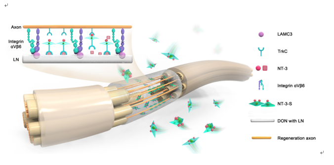 示意圖顯示: (1) PNT通道管壁上的LN或者LAMC3可以與NT-3結(jié)合,形成一種富集NT-3沉積區(qū)域,這有利于表達(dá)TrkC的基因工程雪旺細(xì)胞(NT-3-S)定植生長及其在再生軸突上形成髓鞘的生態(tài)位。(2) PNT持續(xù)分泌的NT-3可以促使表達(dá)TrkC的神經(jīng)元軸突向坐骨神經(jīng)缺損/移植處延伸,這時(shí)空可能涉及NT-3與TrkC以及LAMC3與整合素aVβ6的配體與受體相互作用。