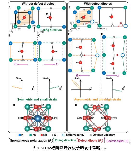 為增強缺陷偶極子與自發(fā)極化之間的相互作用,團隊設計了<110>取向的缺陷偶極子。研究表明,由于<110>方向與正交相KNN陶瓷中的自發(fā)極化平行,該取向的缺陷偶極子與自發(fā)極化之間的相互作用力是傳統(tǒng)<001>取向的缺陷偶極子的3倍。這一設計不僅提高了壓電陶瓷的電致應變,還發(fā)現(xiàn)缺陷偶極子引起的超高表觀應變存在明顯的厚度效應,為理解缺陷偶極子在材料中的分布及其在電場下的響應行為提供了新的啟示。