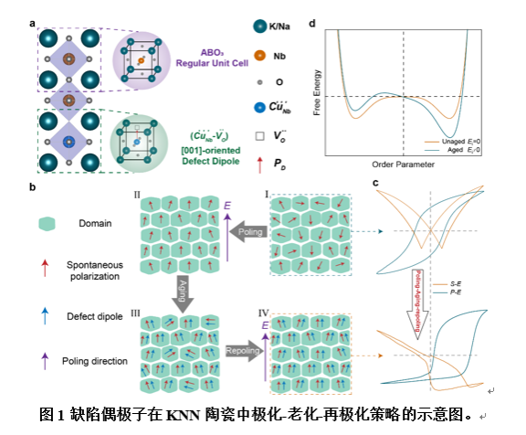 中大新聞網(wǎng)訊(通訊員金明革)高性能壓電材料是研制新一代智能感知器件和精密驅(qū)動器件的關鍵。其中,鈮酸鉀鈉基無鉛壓電陶瓷被認為是未來替代鉛基壓電材料的有力候選者。然而,傳統(tǒng)無鉛壓電陶瓷材料存在電致應變較?。ㄍǔ5陀?.3%)和溫度穩(wěn)定性較差等問題,限制了其實際應用。近年來研究發(fā)現(xiàn),缺陷偶極子對壓電陶瓷的電學性能具有顯著影響:一方面,缺陷偶極子可以通過釘扎效應抑制疇壁運動;另一方面,缺陷偶極子在電場下會產(chǎn)生顯著響應。通過缺陷偶極子的拉伸實現(xiàn)超高的電致應變在近年來被廣泛報道。然而,關于缺陷偶極子的形成機制及其與壓電材料性能的關系仍未完全闡明;通過缺陷偶極子的設計,開發(fā)高性能的壓電材料已成為研究的熱點之一。