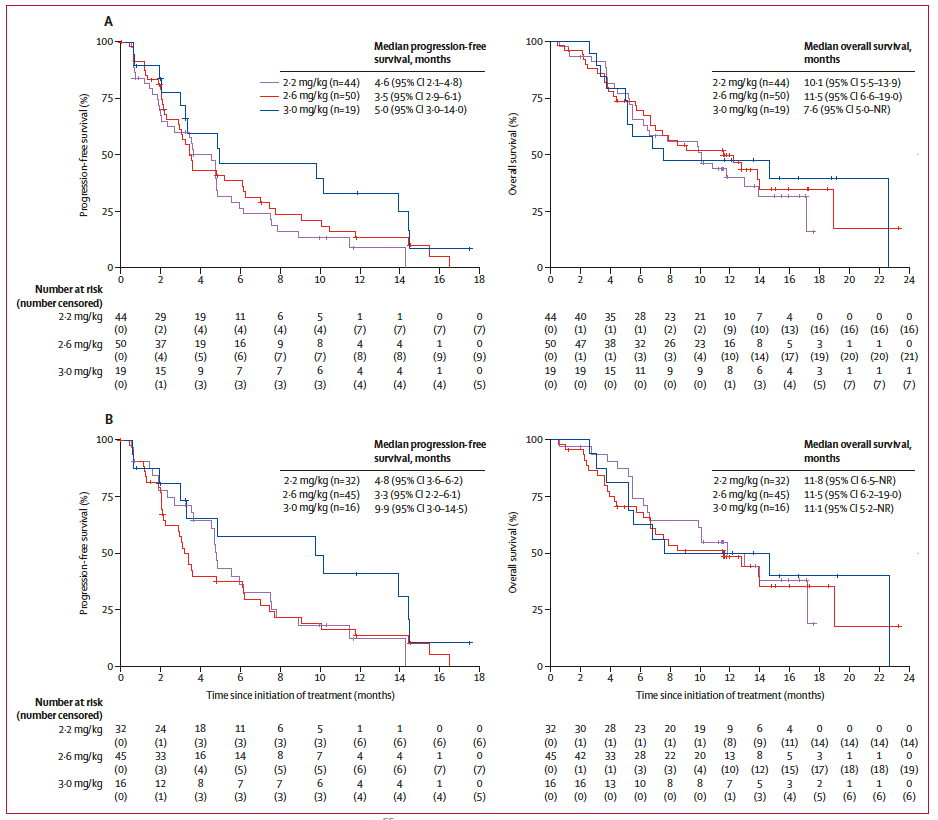 2020年12月24日至2023年2月23日期間,研究共納入27例晚期實(shí)體瘤患者(其中13例為胃癌/胃食管結(jié)合部腺癌,14例為胰腺癌)進(jìn)行劑量遞增階段的研究,以及107名晚期胃癌或胃食管連接部癌患者進(jìn)行劑量擴(kuò)展階段的研究,這些患者均為多線標(biāo)準(zhǔn)治療后失敗的患者。研究分析了2.2 mg/kg、2.6 mg/kg和3.0 mg/kg三個(gè)劑量組胃癌/胃食管結(jié)合部腺癌患者的療效數(shù)據(jù),在109例病灶可評(píng)價(jià)患者中,客觀緩解率(ORR)為29%,經(jīng)確認(rèn)的疾病控制率(DCR)為65%。其中,89例Claudin 18.2高表達(dá)(定義為≥20%腫瘤細(xì)胞中Claudin 18.2染色強(qiáng)度≥2+)的患者,經(jīng)確認(rèn)的ORR為35%,經(jīng)確認(rèn)的DCR為70%。所有Claudin 18.2高表達(dá)患者中,中位無進(jìn)展生存期(PFS)為4.8個(gè)月,中位總生存期(OS)為11.8個(gè)月。研究最終確定CMG901的推薦劑量為2.2 mg/kg,為后續(xù)III期研究的開展提供了支持,提示CMG901有望在未來成為Claudin 18.2高表達(dá)胃癌/胃食管結(jié)合部腺癌患者的治療新選擇。