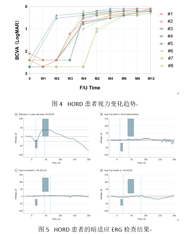 患兒視力在急性期大多降至手動或以下,隨后在發(fā)病后的3-4周后開始恢復(fù)。發(fā)病12個月時,視力多數(shù)(87.5%)達到0.5或以上(圖4)。然而,全視野ERG提示視桿及視錐反應(yīng)均完全熄滅(圖5)。